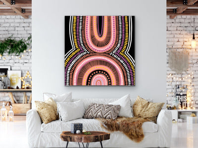 The colours are those that cover my country “Mayi Country” I want to pay my respect to the land my people come from and Mother Earth, as she is our safety and our protector providing us all shelter.