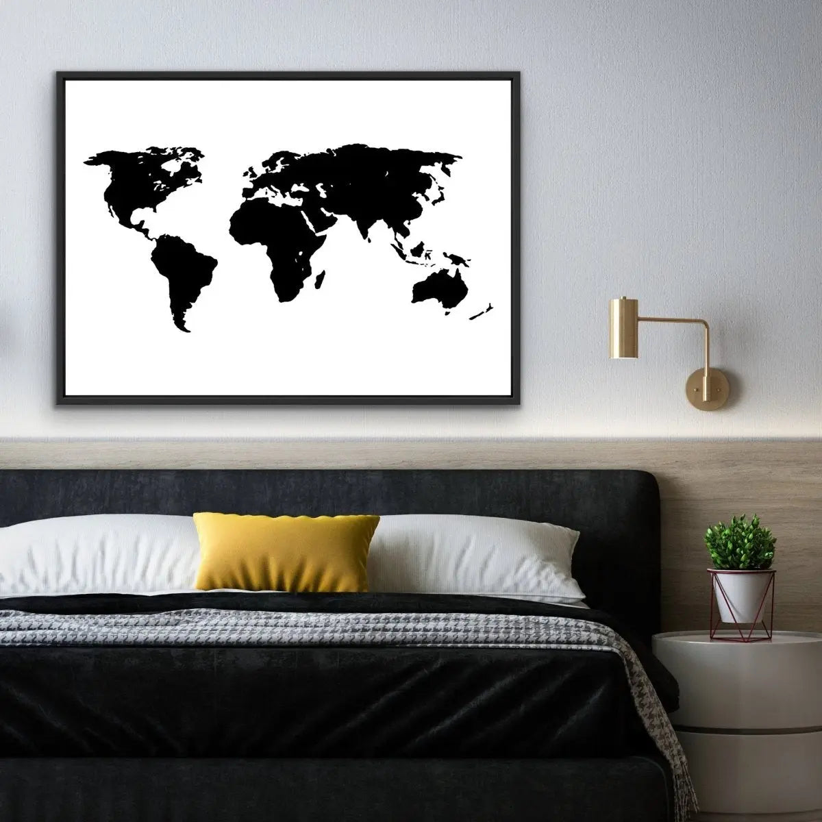 Black and White World Map - Framed Canvas Wall Art Print - I Heart Wall Art - Poster Print, Canvas Print or Framed Art Print