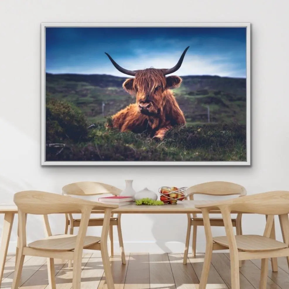 Resting Highlander - Highland Cow Landscape Framed Canvas Print Wall Art Print