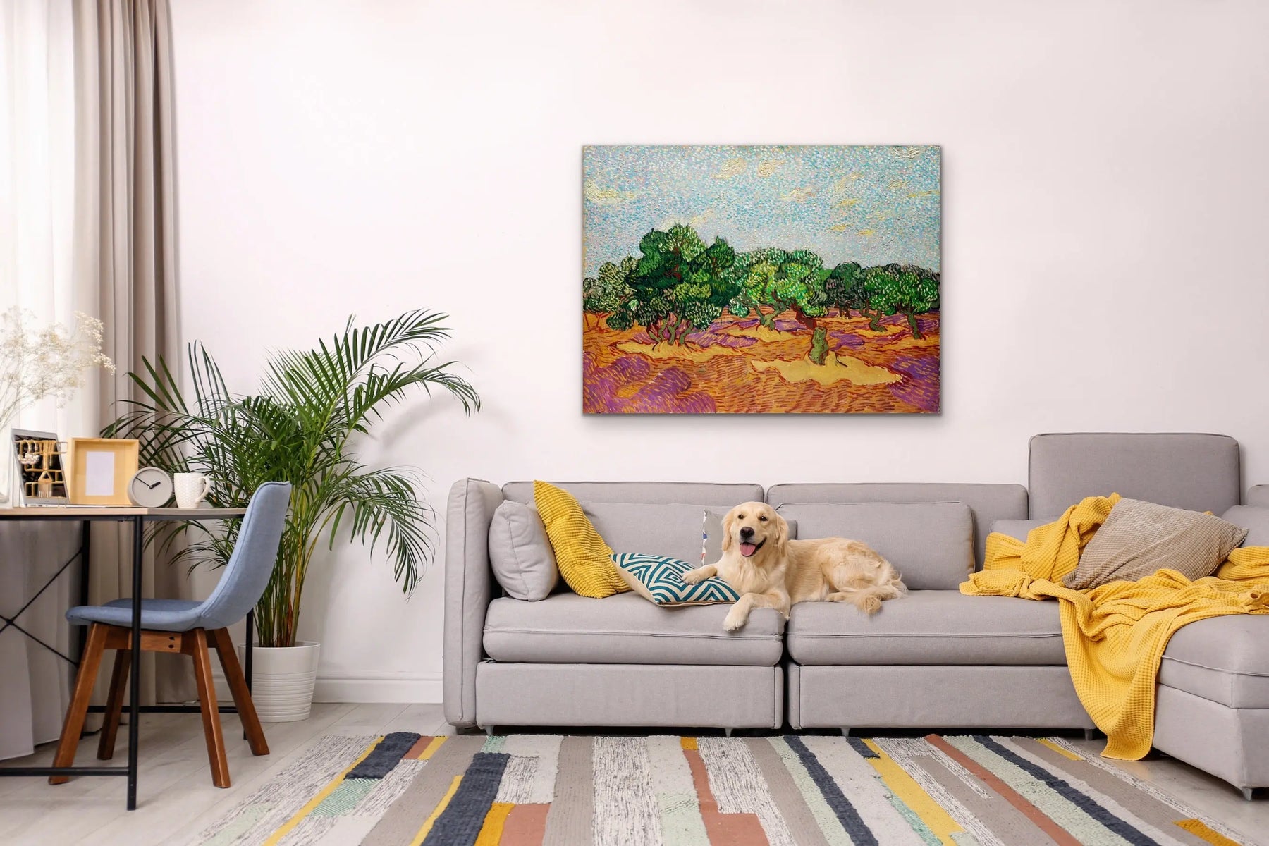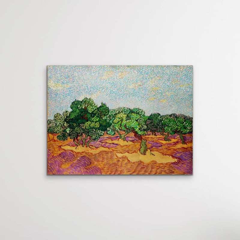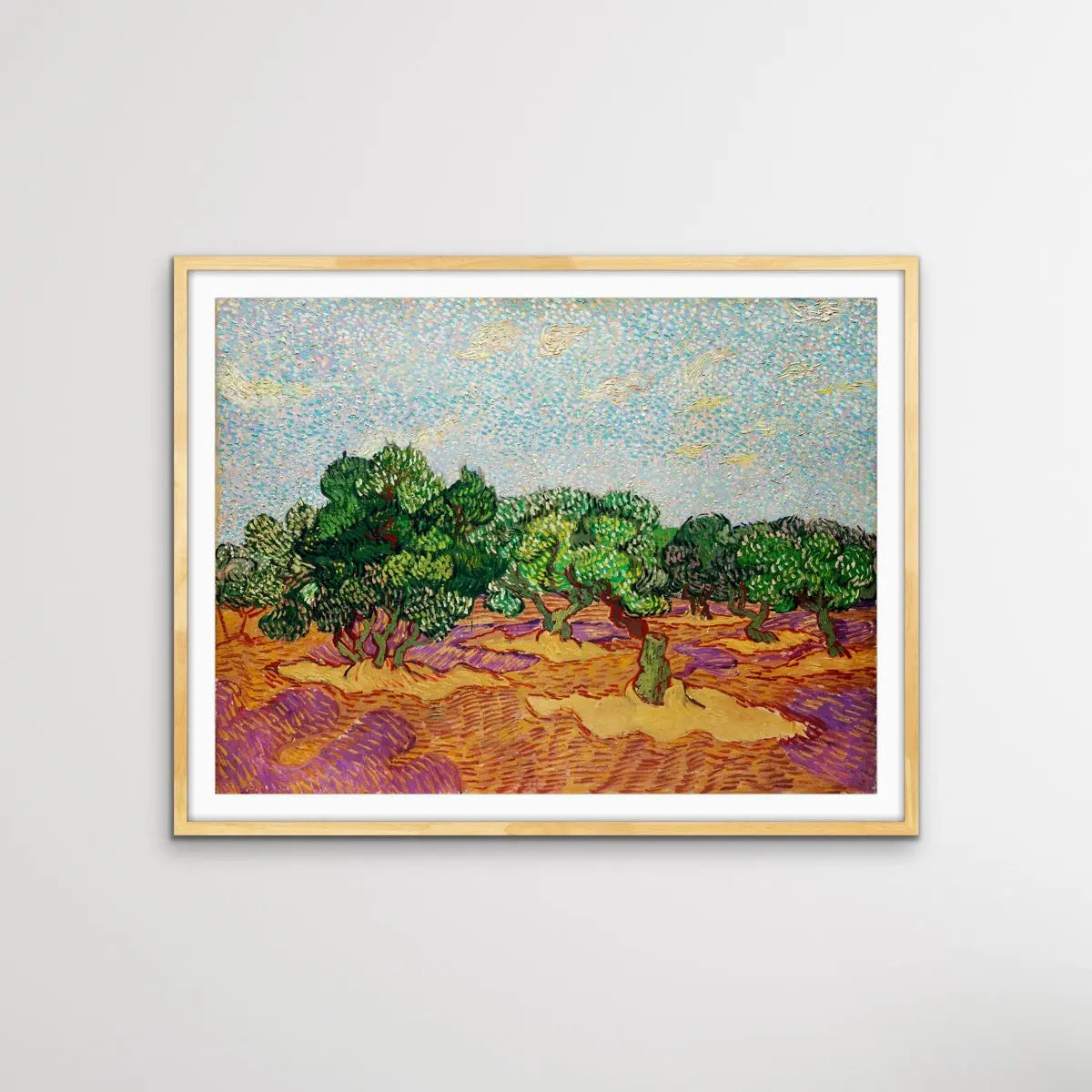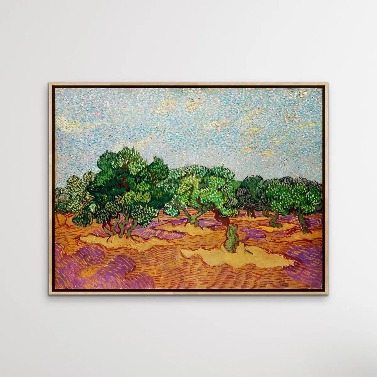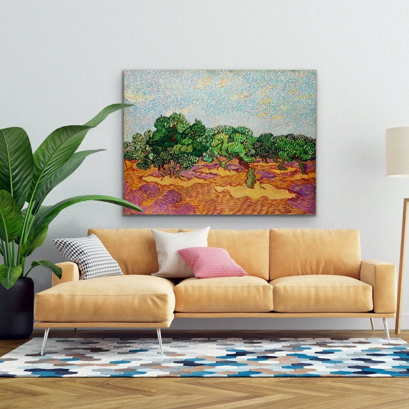 Why go past the classics? This stunning print of the original painting by Vincent Van Gogh looks perfectly contemporary, rendered in shades of orange and pink. This is an enhanced version of the original artwork.