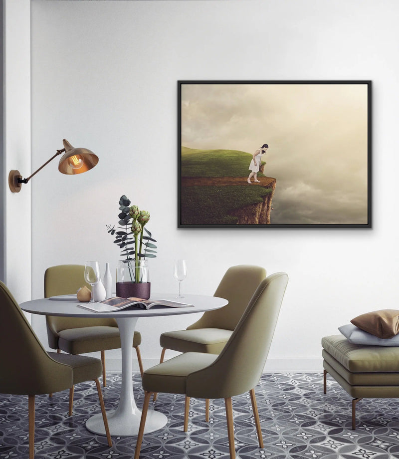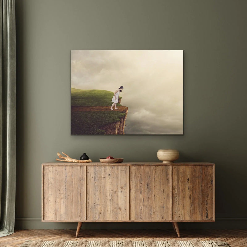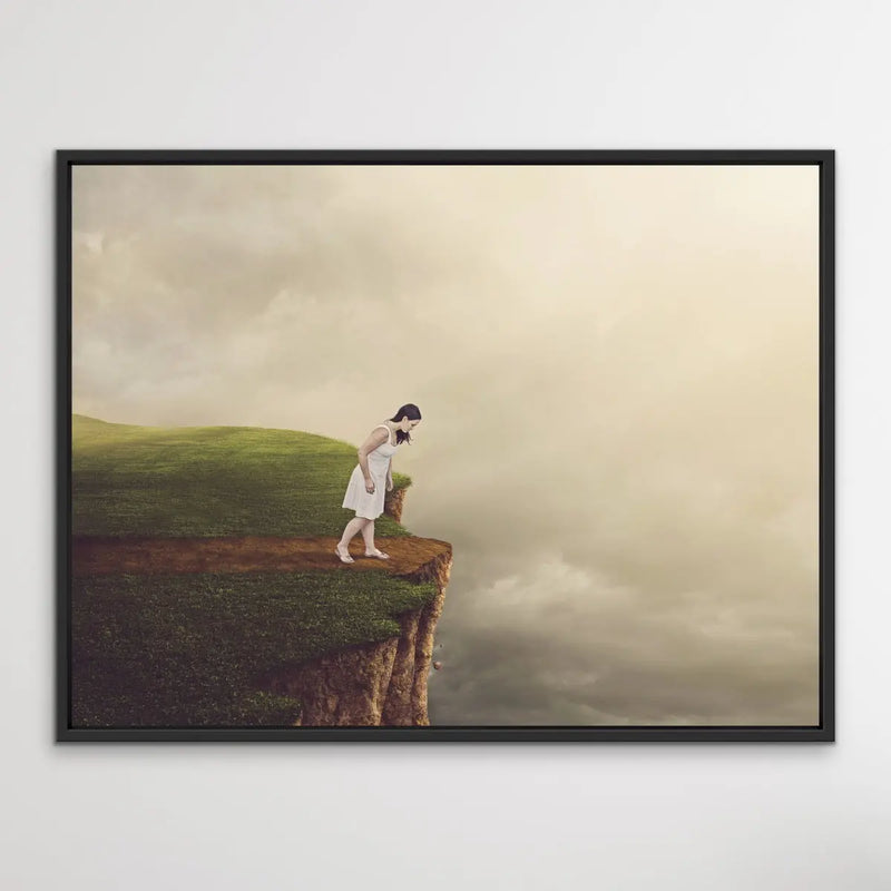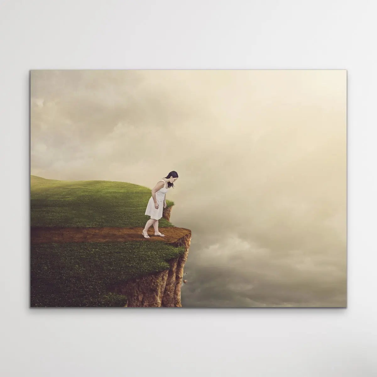 This evocative print features a woman standing on the edge of a cliff, peering in the beyond...