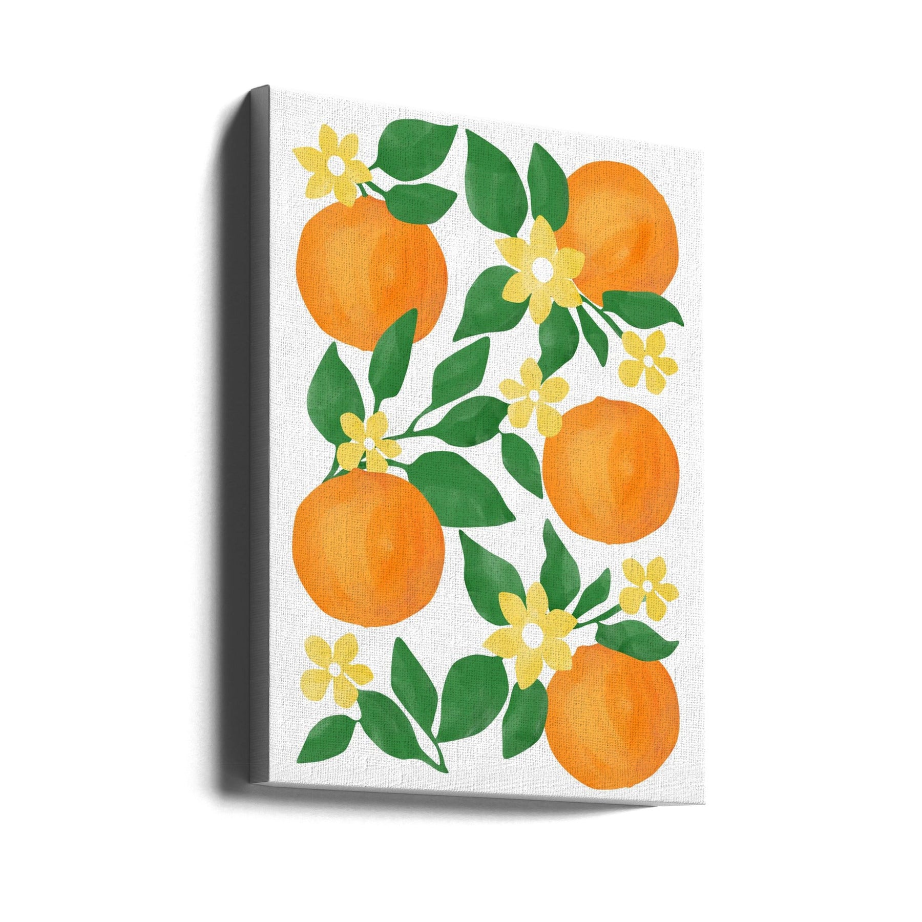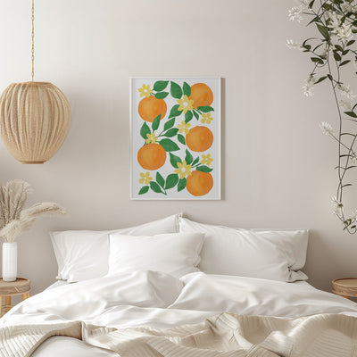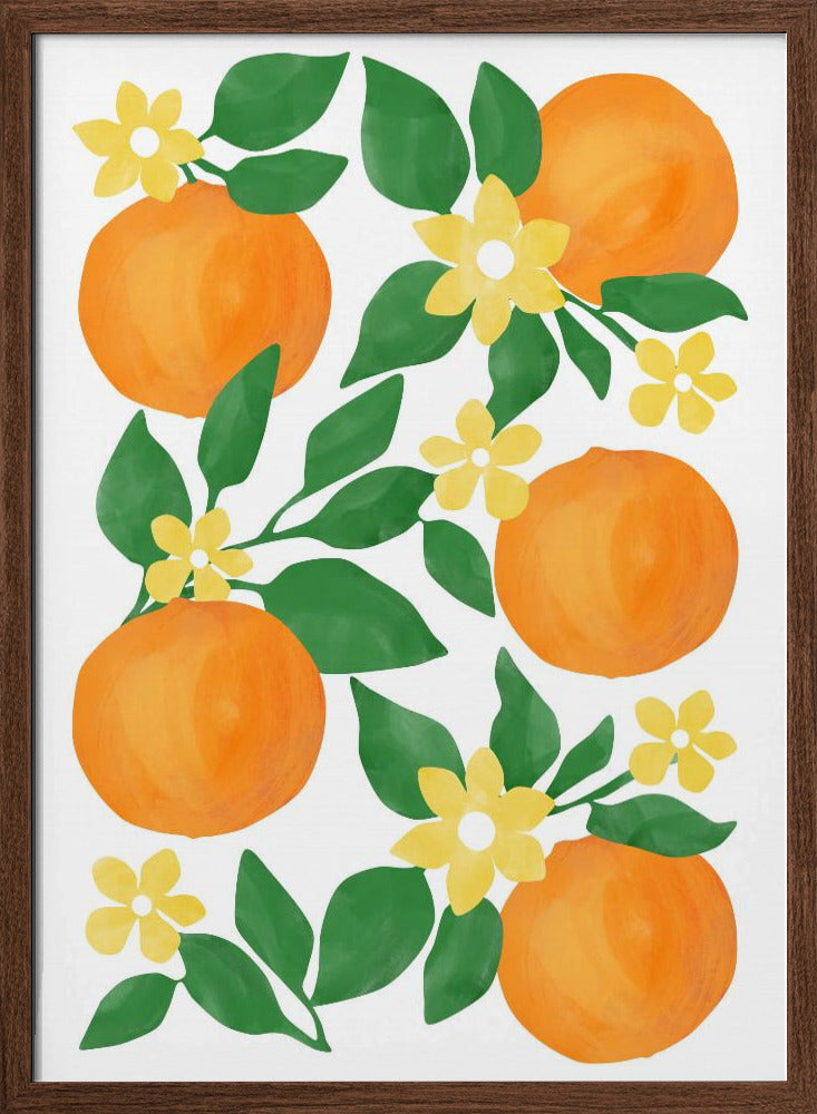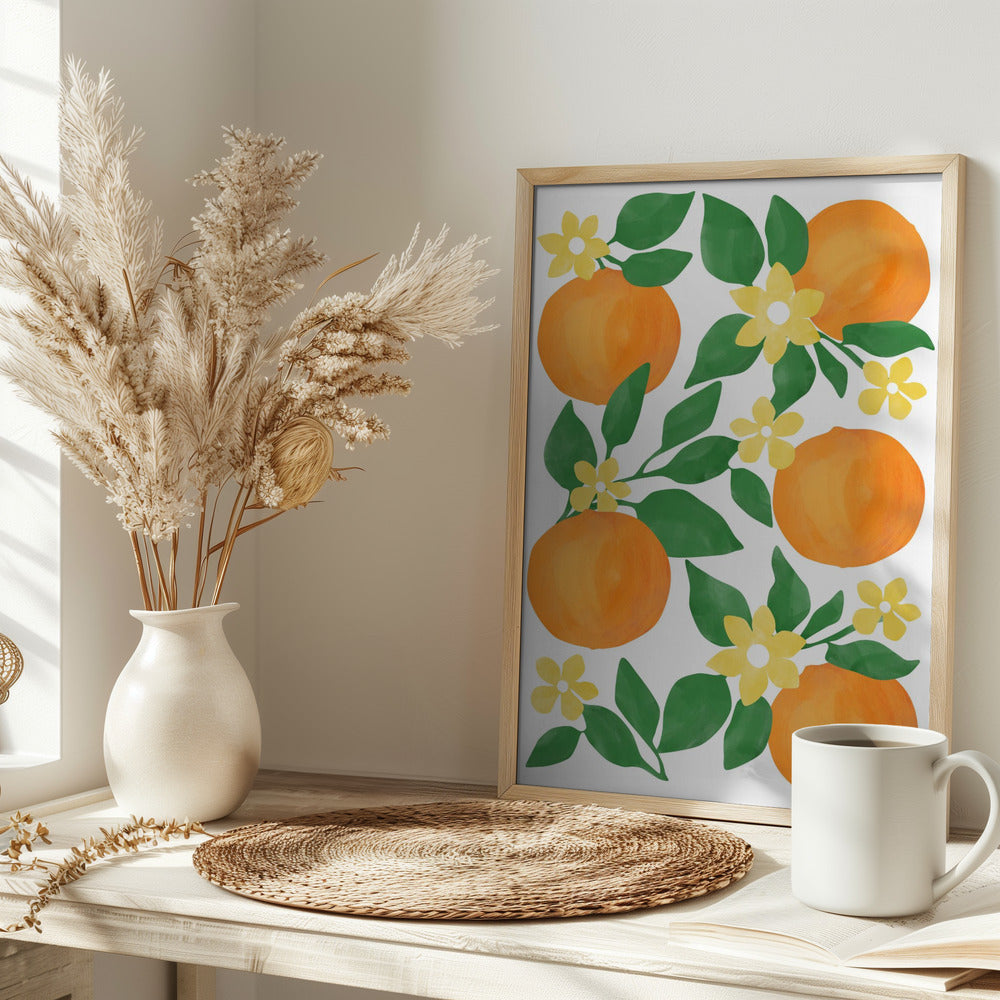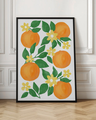 Explore our many print options for Oranges with Green Leaves and Delicate Yellow Flowers by artist Elena Ristova.