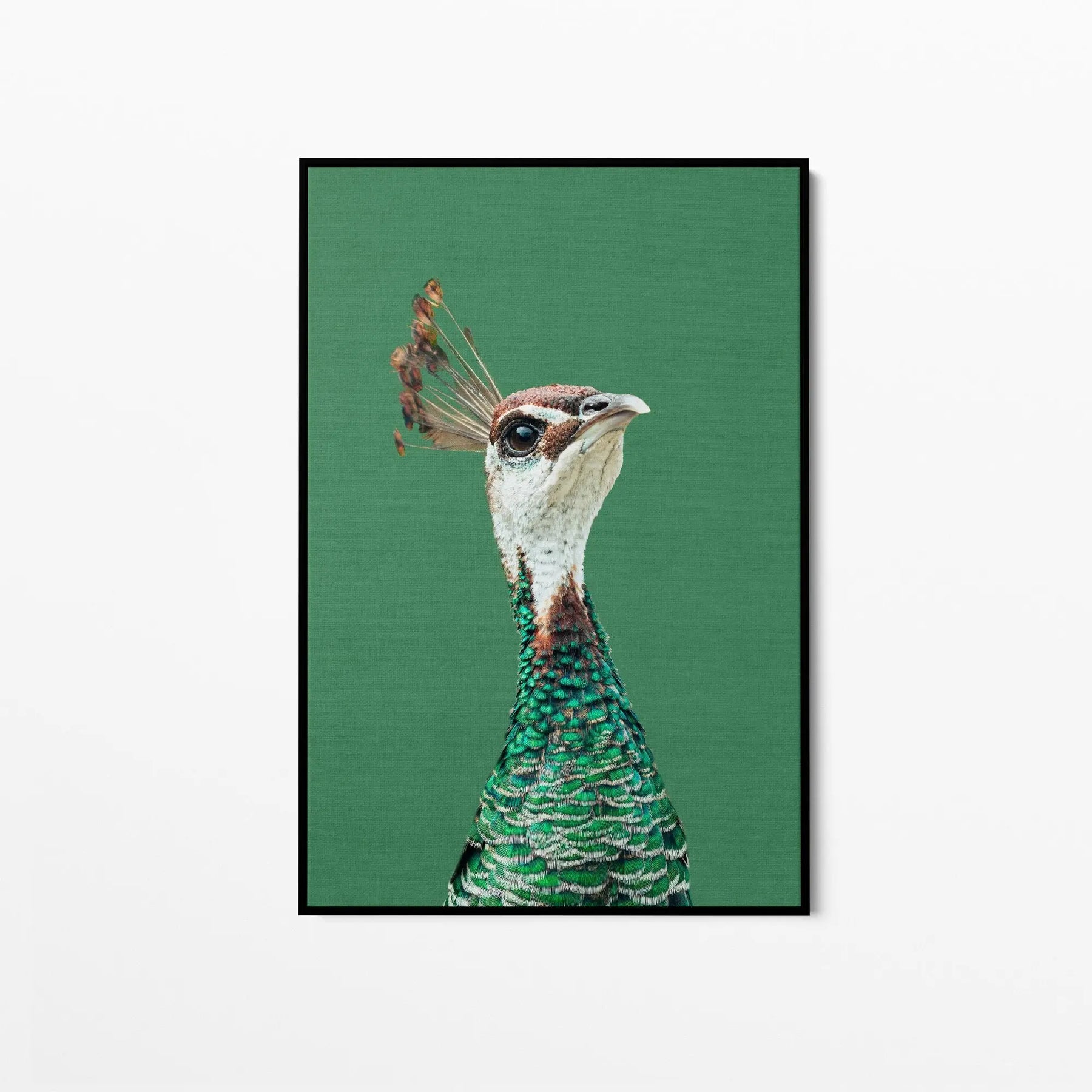 This beautiful, vivid peahen/ peafowl is captured in front of a deep green linen background. She's the perfect piece for any bird lover looking for something beautiful, bold and a little bit different!