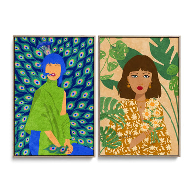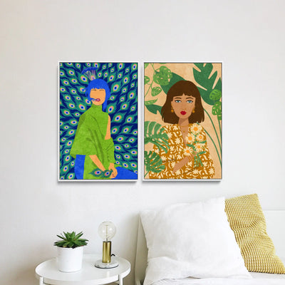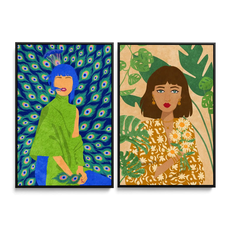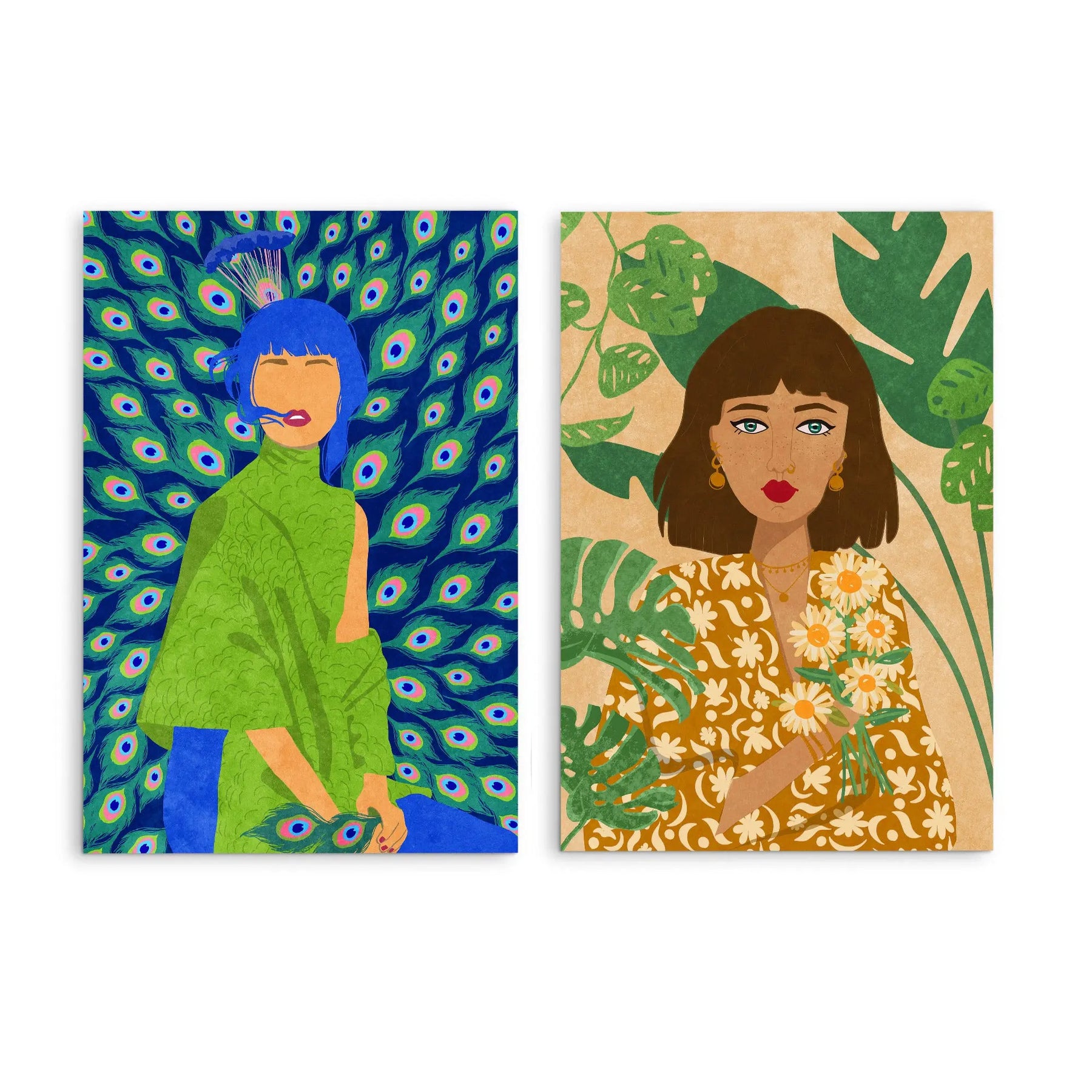 Enjoy the colourful world of Raissa Oltmanns with our Peacock Woman and Plantlady art set. Contemporary, boho-inspired, and bursting with colors. Available as a diptych canvas or art print set.