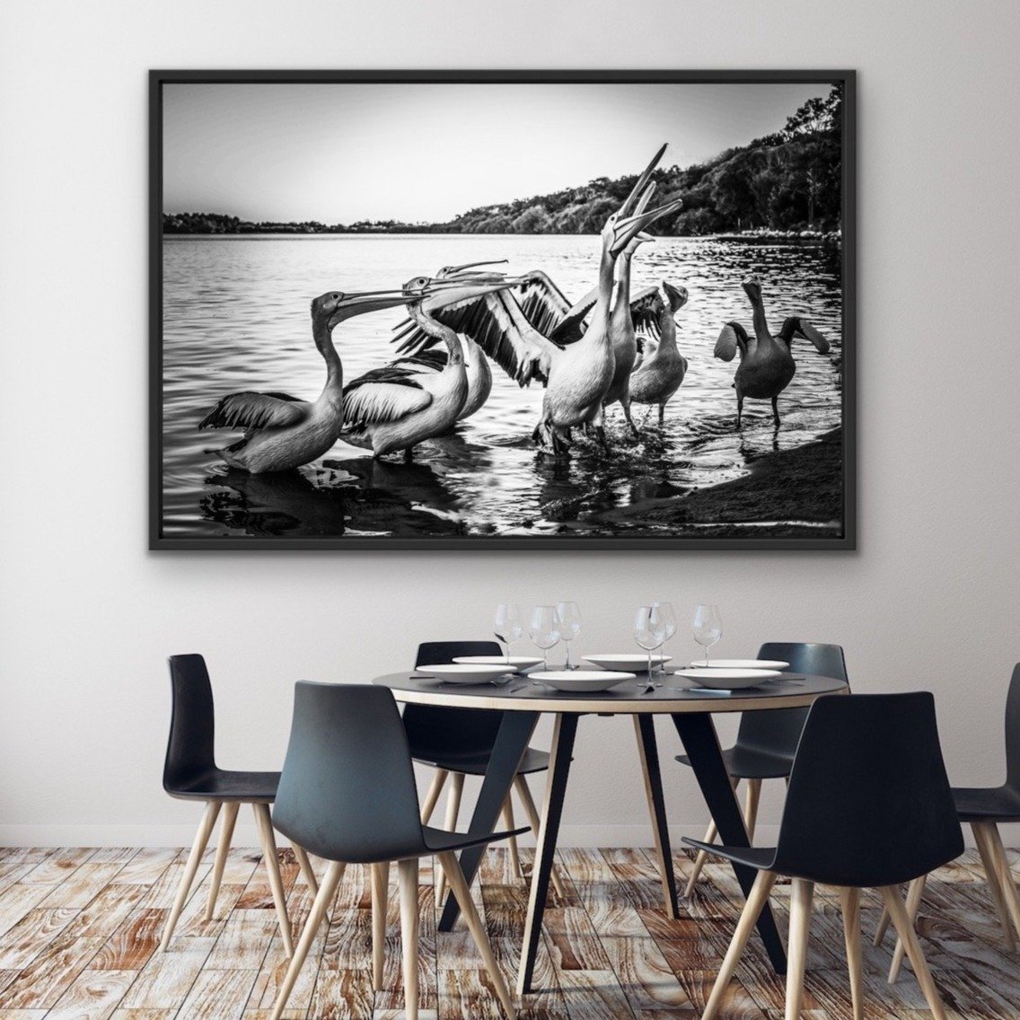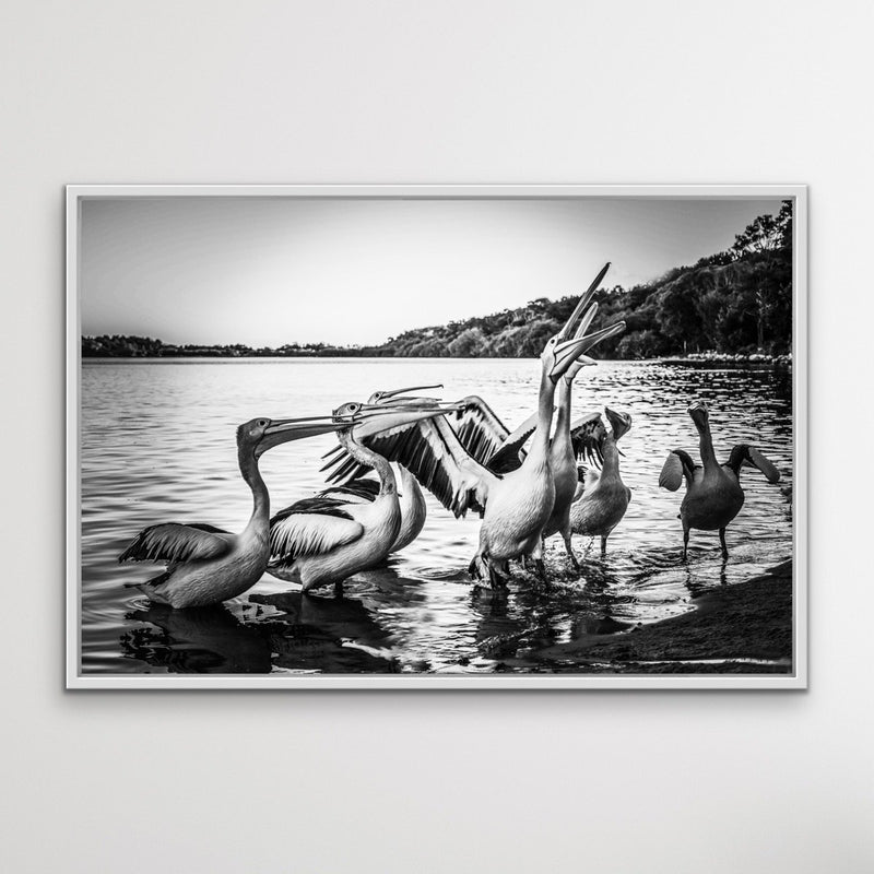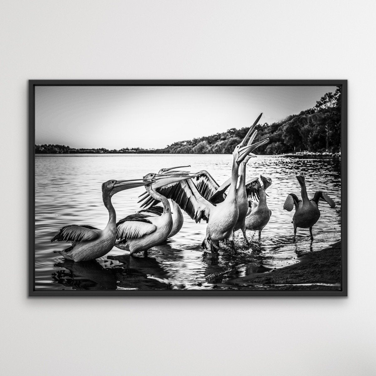 This calm Black and White print featuresa beautiful flock of pelicanson the shore. Timeless and elegant, this print is perfect for relaxed beach home styling.