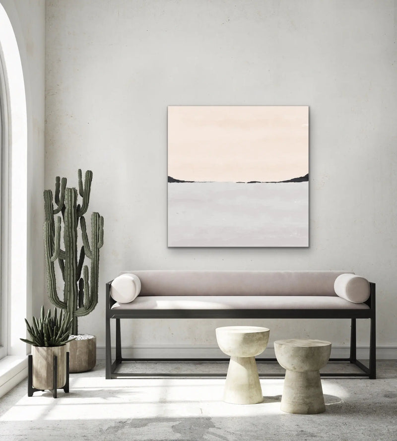 This simple, evocative landscape artwork print is perfect for contemporary home styling, in shades of soft pink and grey.