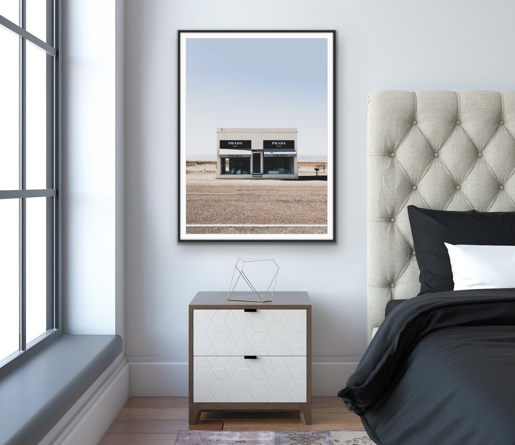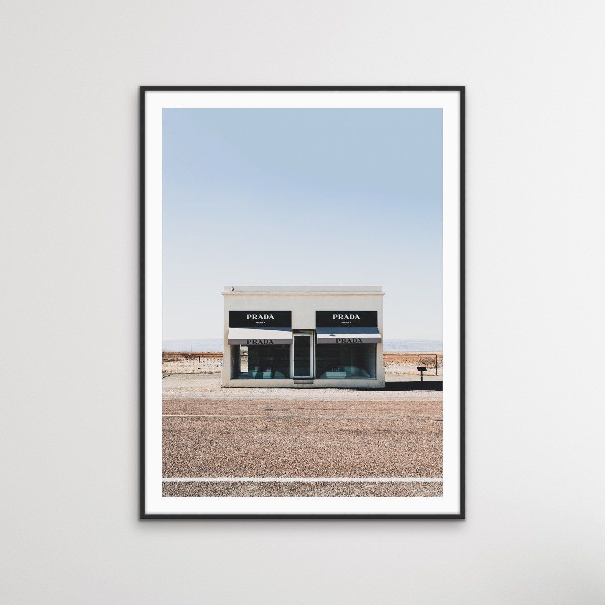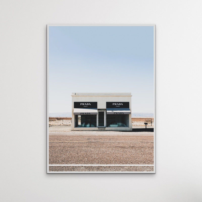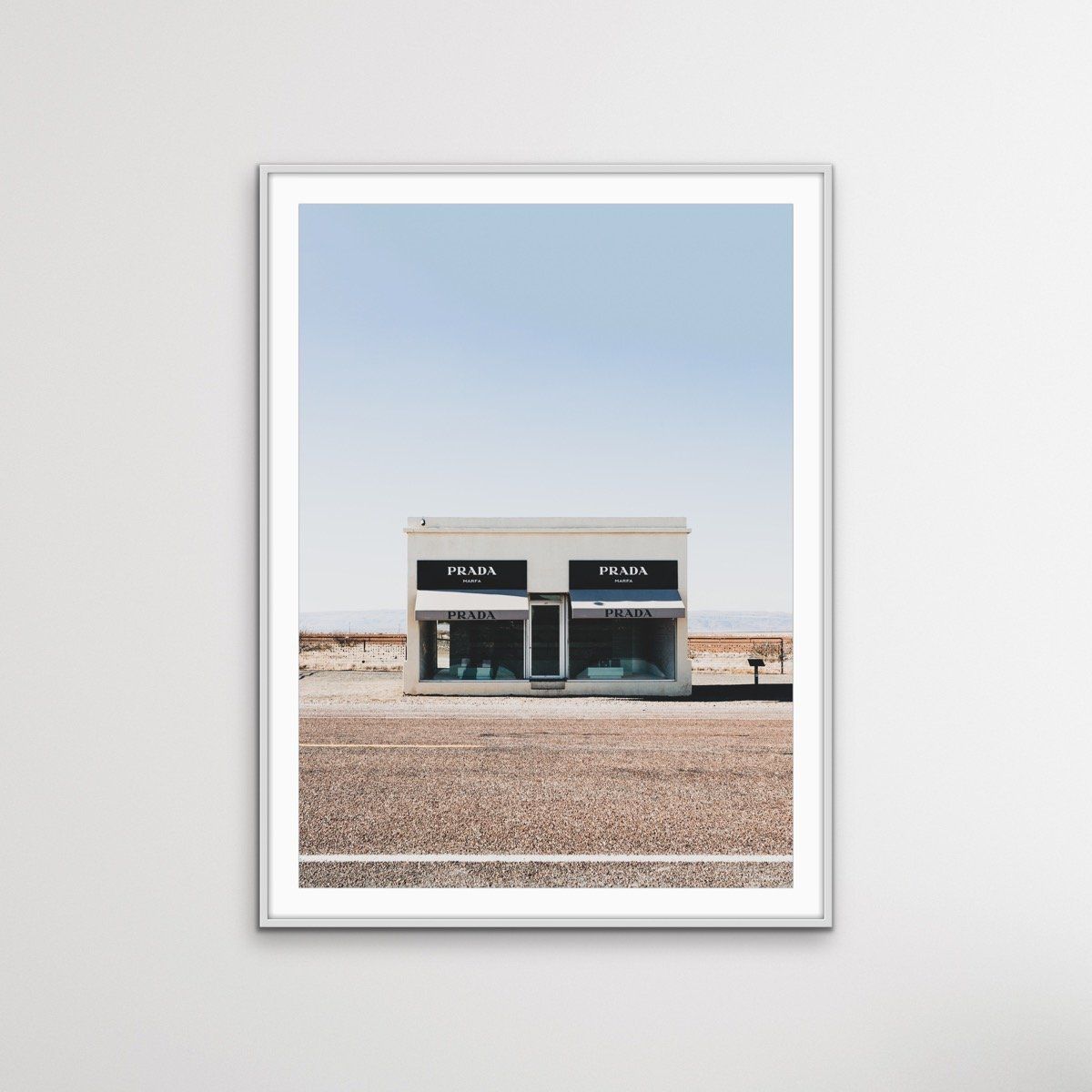 This print features a photograph of the famous Prada Marfa art installation, perfect for a touch of understated glamour in your space.