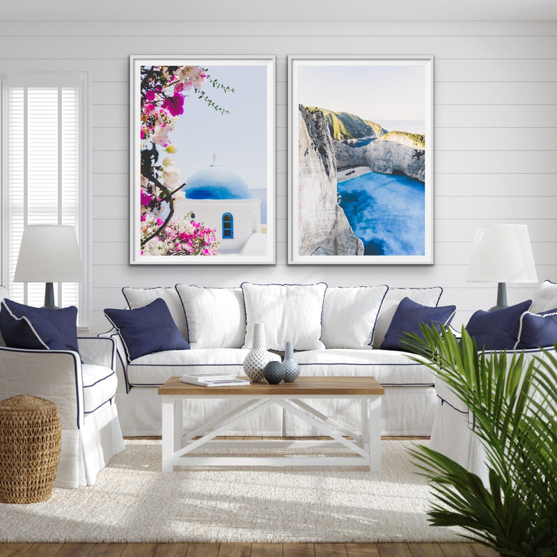 These stunningphotographic prints of the Greek Isles are perfect for coastal or beach home styling with a bold pop of colour.
