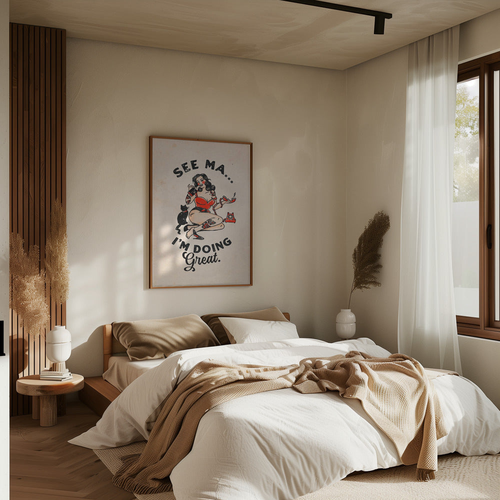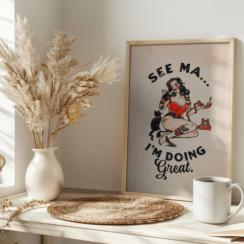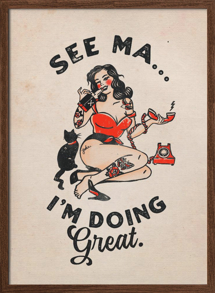 Explore our many print options for See Ma Poster Funny Vintage Pinup Girl & Cat by artist The Whiskey Ginger.