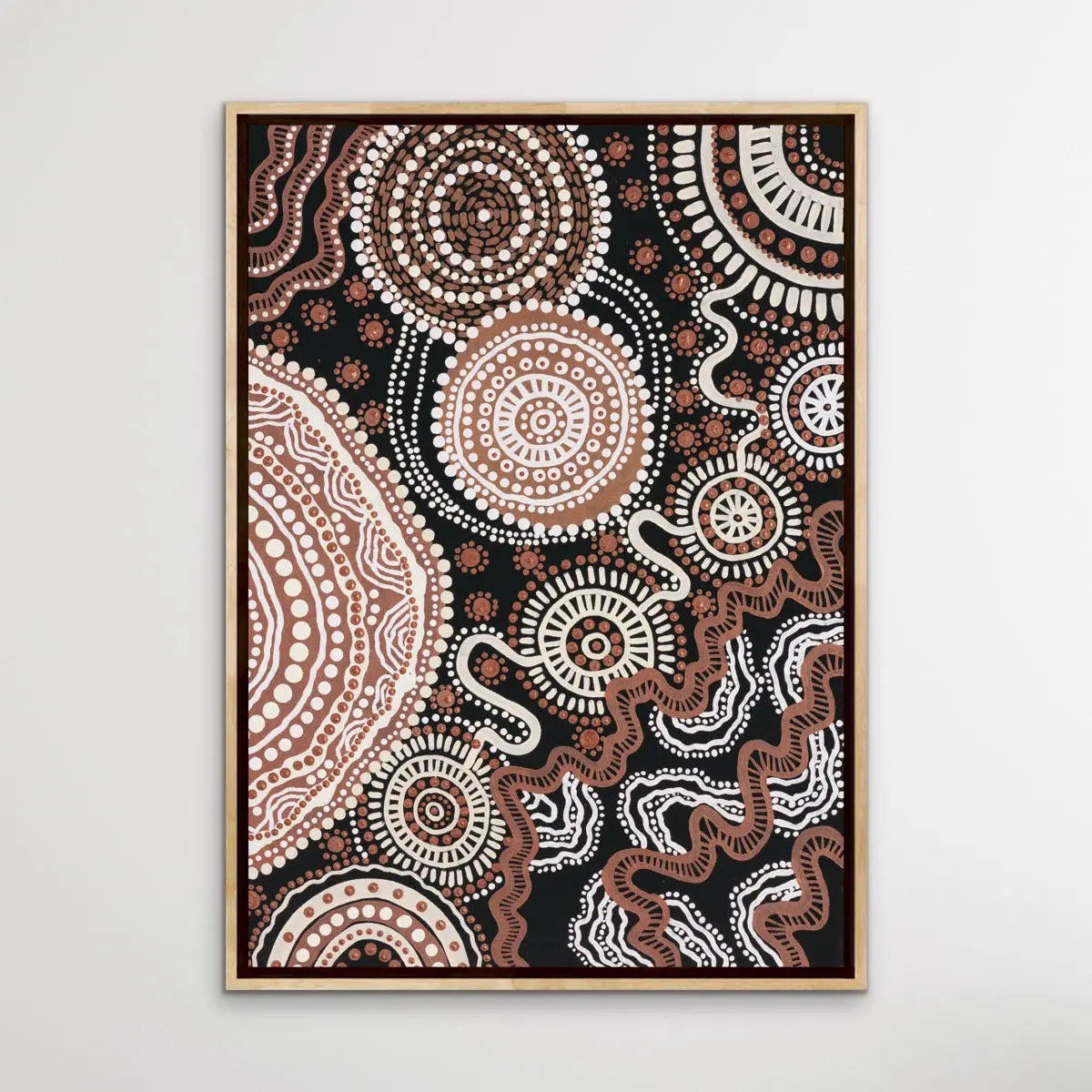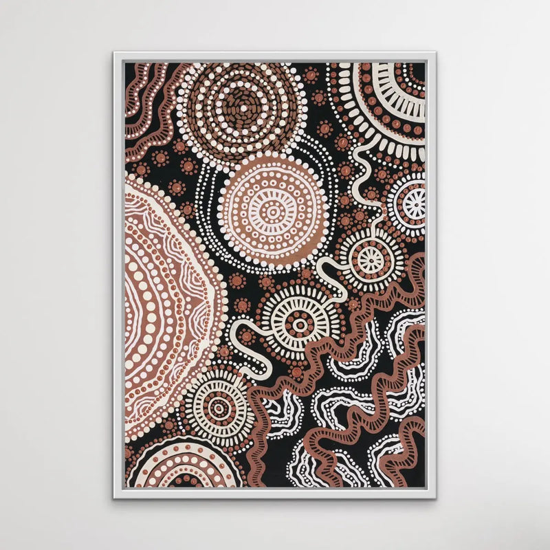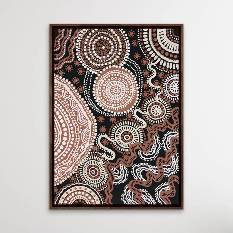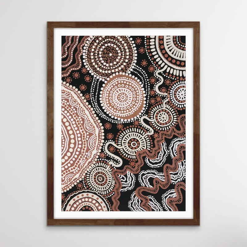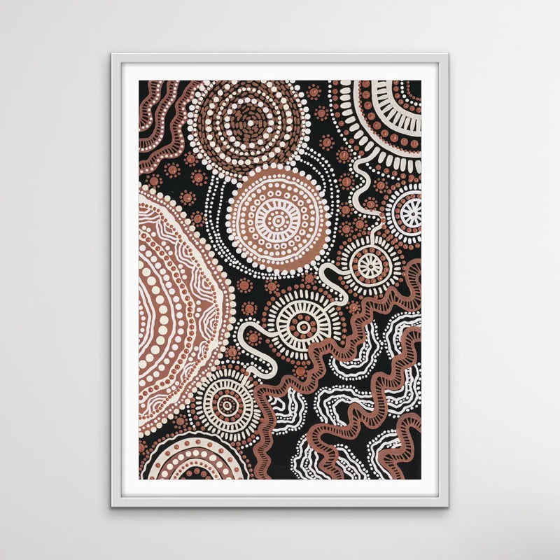 This stunning, traditional style artwork is a print of the original painting by Brisbane-based Aboriginal artist Leah Cummins. It is one of a series of three.