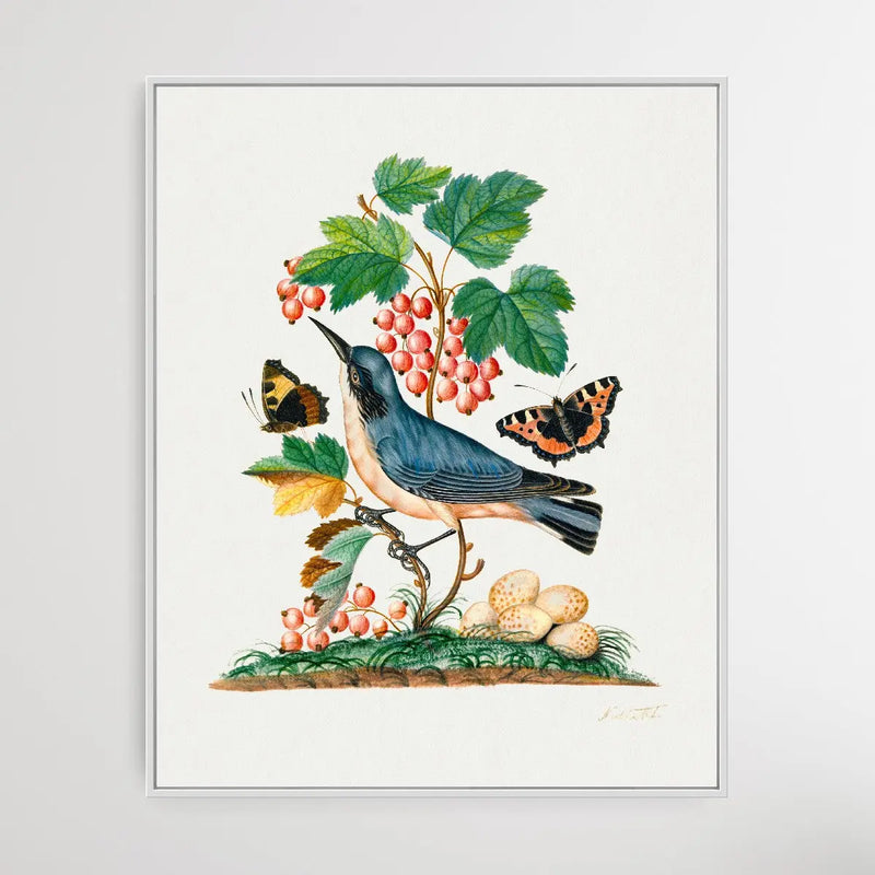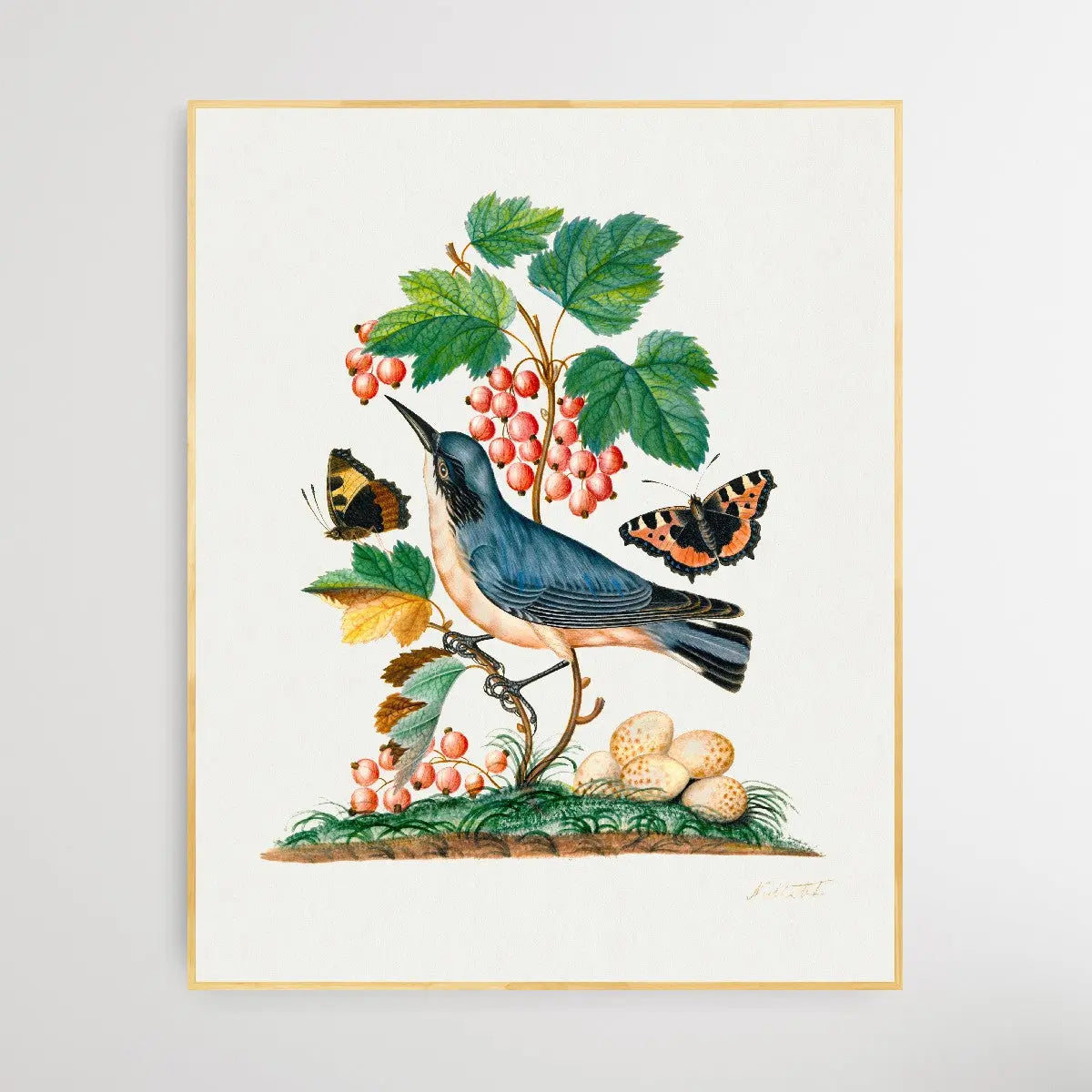 Subalpine Warbler and eggs, strawberry, Red Admiral, wasp cocoon, ants and cocoons from the Natural History Cabinet of Anna Blackburne (1768) painting in high resolution by James Bolton.
