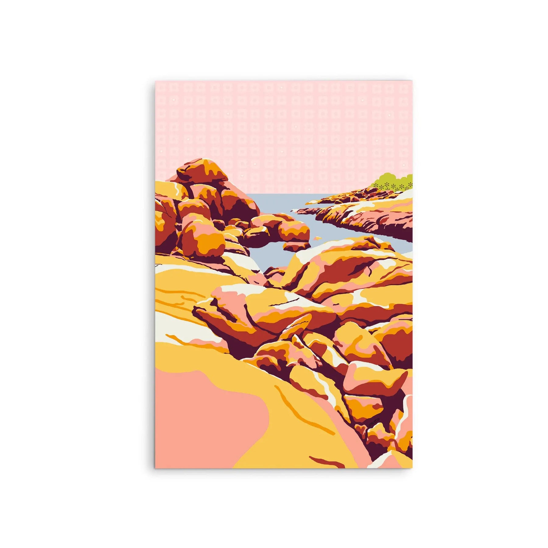 Celebrate the beautiful colour and shape of Tasmania with Unratio's joyous collection. These bold, bright artworks celebrate the magic of Tasmanian days at the beach. Unratio is a contemporary artist based in Tasmania. "I started making art under the name, Unratio (meaning abstract not in proportion or pattern) in 2018. My work is the fine art of flowers, nature and the sea, inspired by summer colour and heritage patterns. My bright, colourful, abstract landscapes and nature drawings, capture the carefree spirit of childhood imagination and joy. My art is about a place that lives in colour and memory. A beautiful nostalgia with prevailing optimism. I draw the summer of dreams. I often get told that my work reminds people of their own coastal memories. It is humbling and motivating that we can relate to each other through a shared connection to our landscape."Unratio, St Helens, Tasmania.