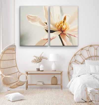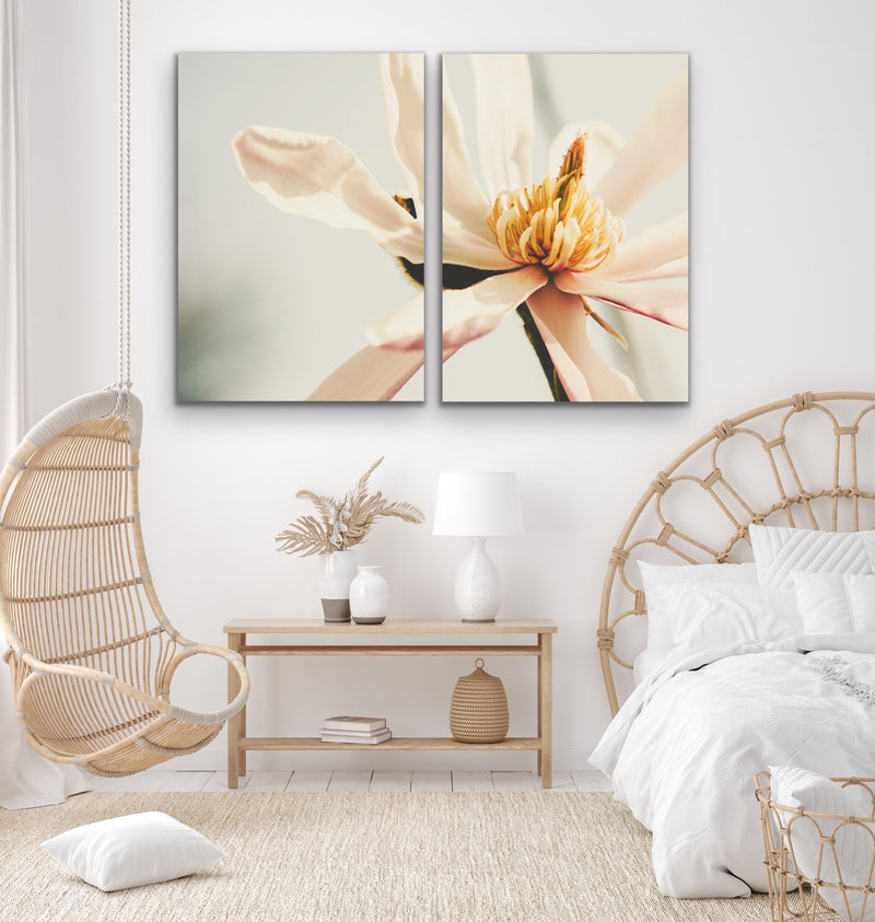 This warm, yellow-toned photographic print is run across two canvases. Perfect for boho bedroom or living space styling, this warm set are soft enough to fit with a number of decor and home interior styles.