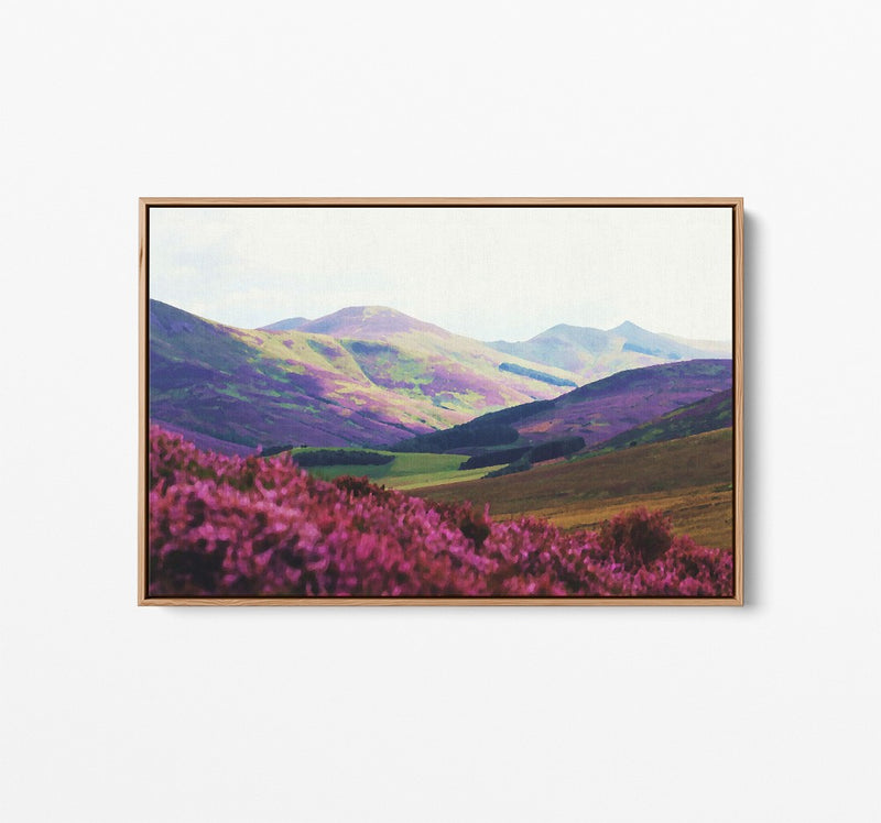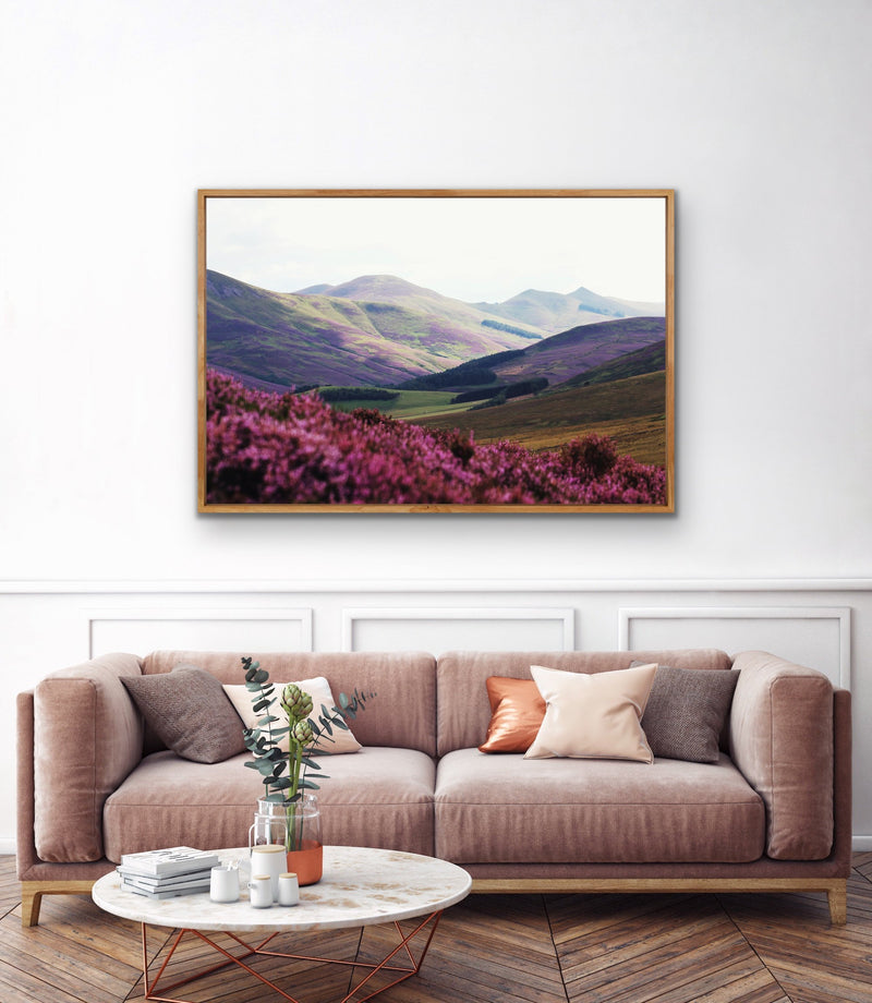 Love Scotland and its beautiful highlands? This print summons up some of the beauty of the Scottish highlands, with beautiful shades of pink and green.