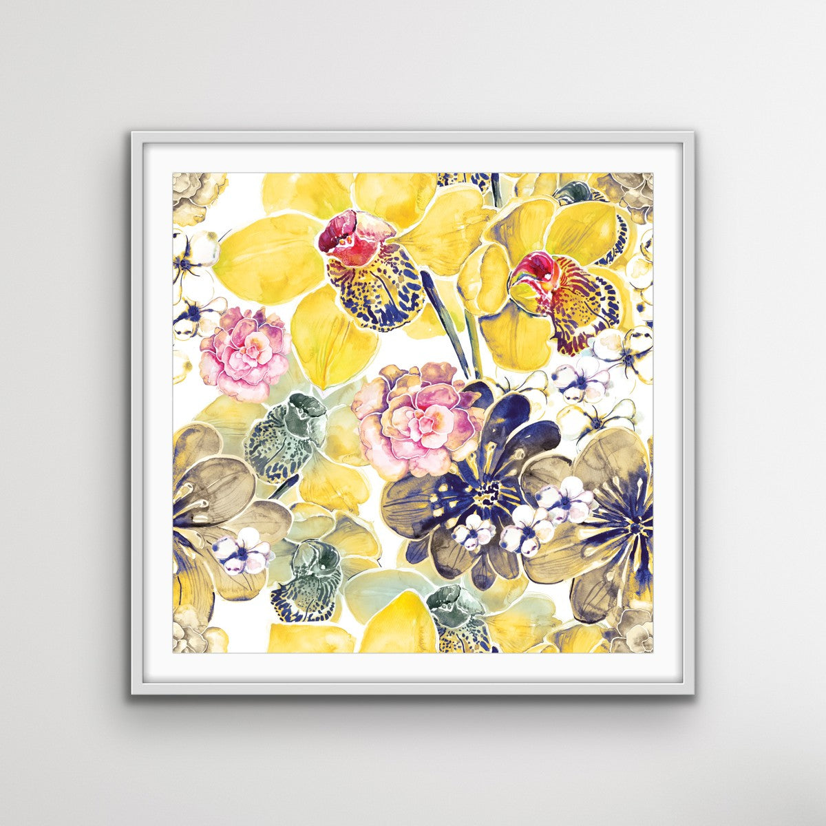 This beautiful floral print features orchids in tones of yellow, red and grey and is cheerful and fun.